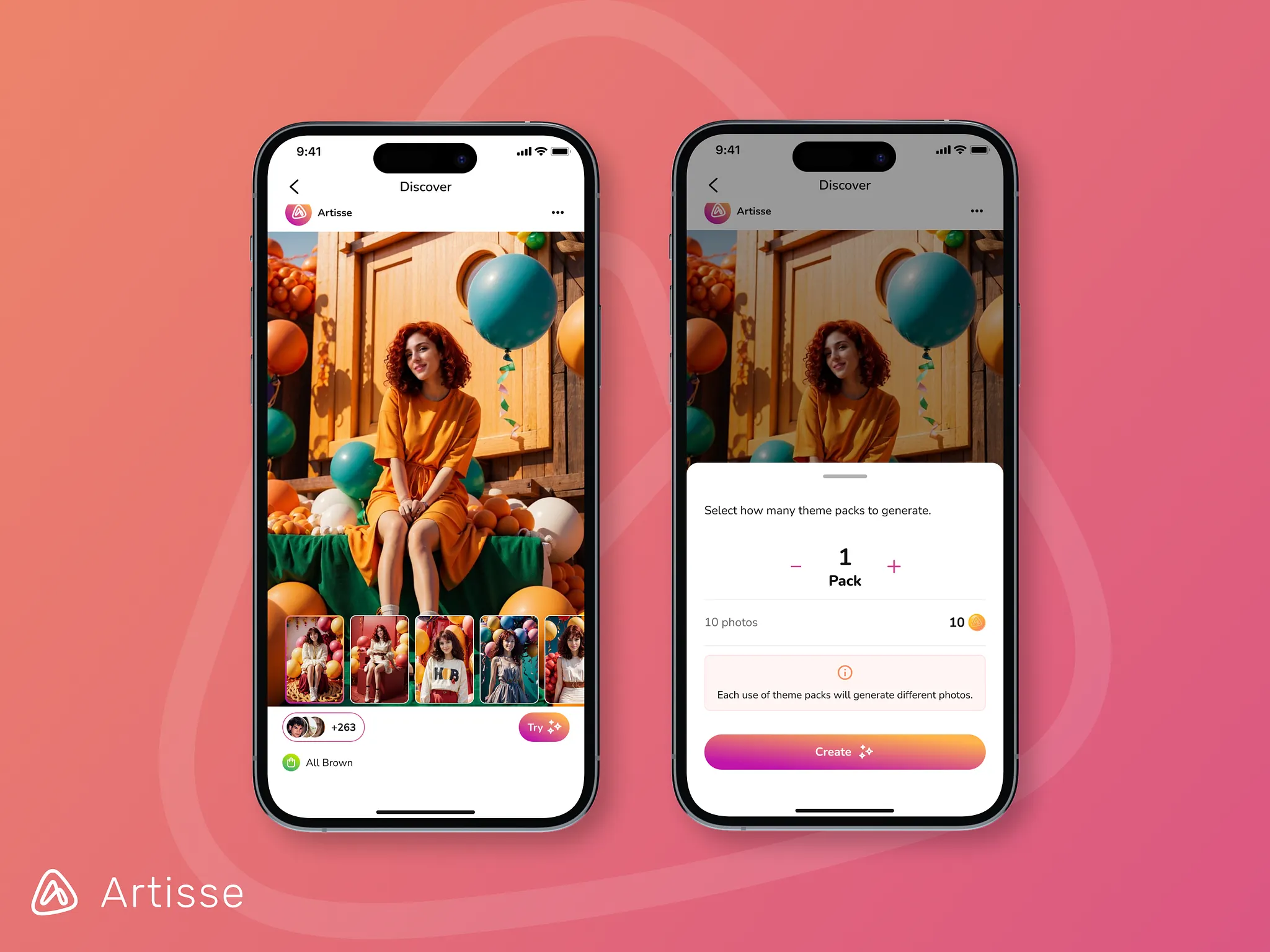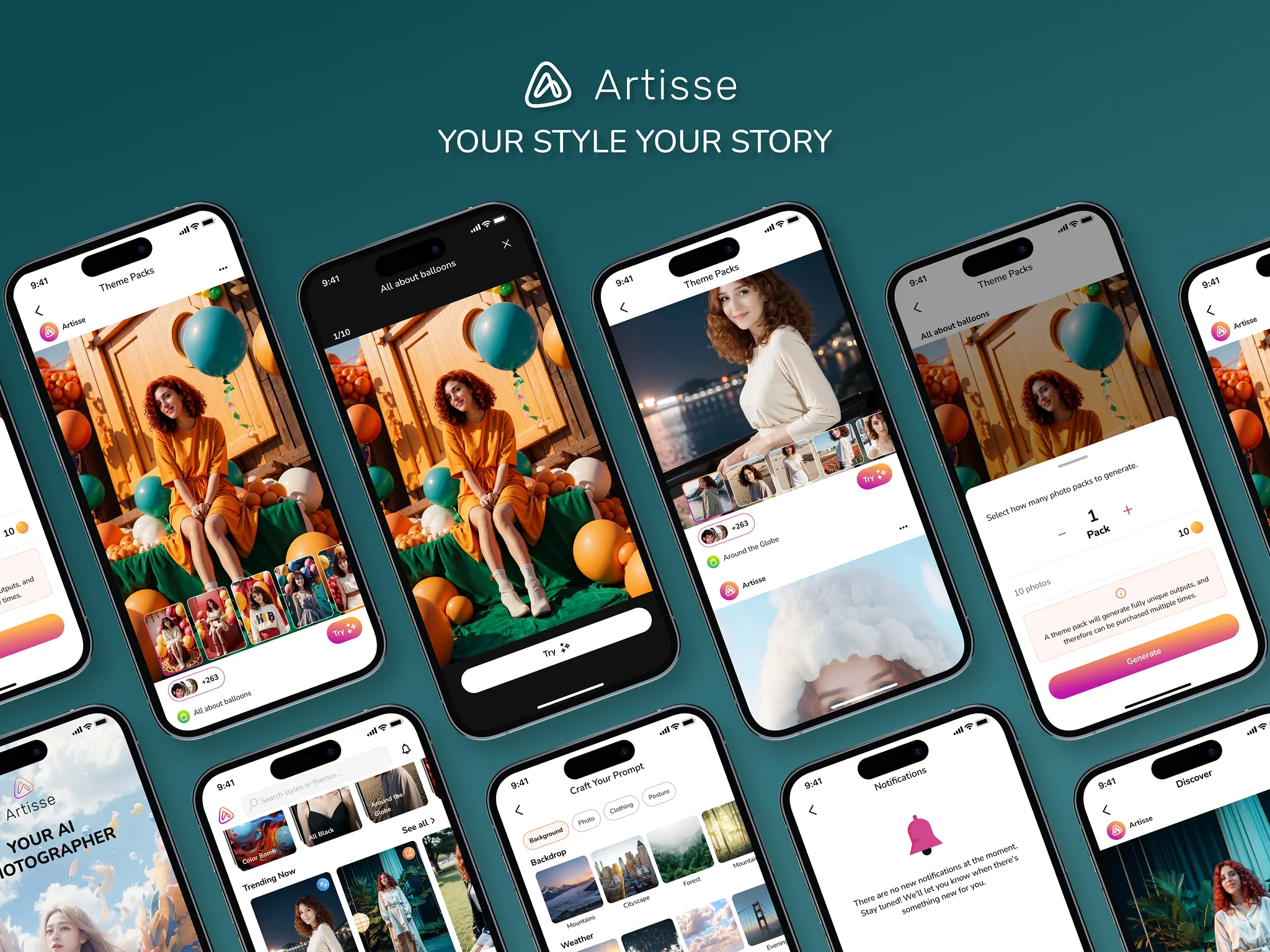 We restructured the generation system into Theme Packs and curated sets of 10 photos tied to a specific aesthetic or story (e.g. “All About Balloons”, “Studio Portraits”, “Around the Globe”).